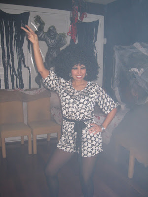 My cousin hosted an amazing Halloween party over the weekend and I have to share some of the highlights. She spent at least 3 days decorating and preparing and I have to say it was a success. We had a mash up of costumes, a dog and a cat dressed up, a smoke machine that scared the heebie jeebies out of her dog, a black light to display creepy messages and a strobe light to keep our eyes well focused and cross-eyed all night. BTW, I was very impressed by my DIY Bride of Frankenstein costume.